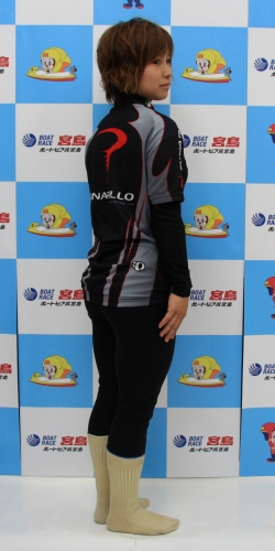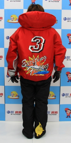 最後に勝負服を着て準備完了! もちろん、ヘルメットもかぶります。 この勝負服は薄手の生地のように見えますが、艇番色の生地の下にはケブラーズボンと同じ黄色い生地が入っていますので、かなり固いです。 デザインは何種類もありますが、色が分かりやすいことから宮島ではこのデザインを長らく採用しています。 |